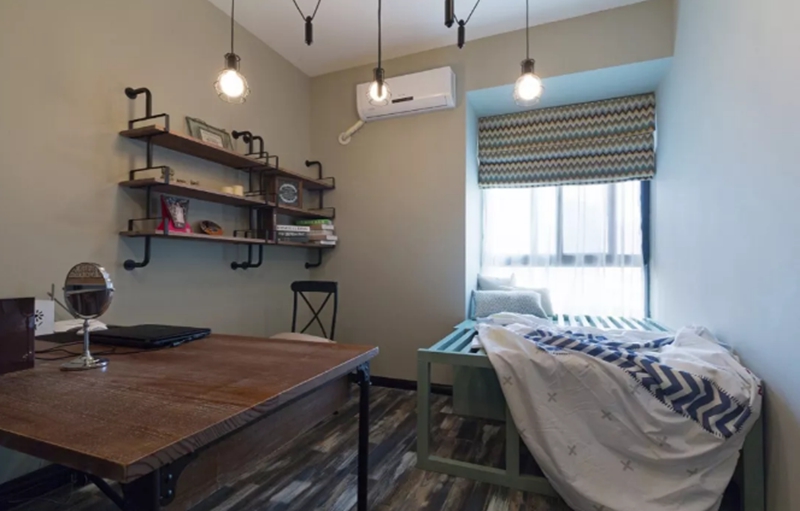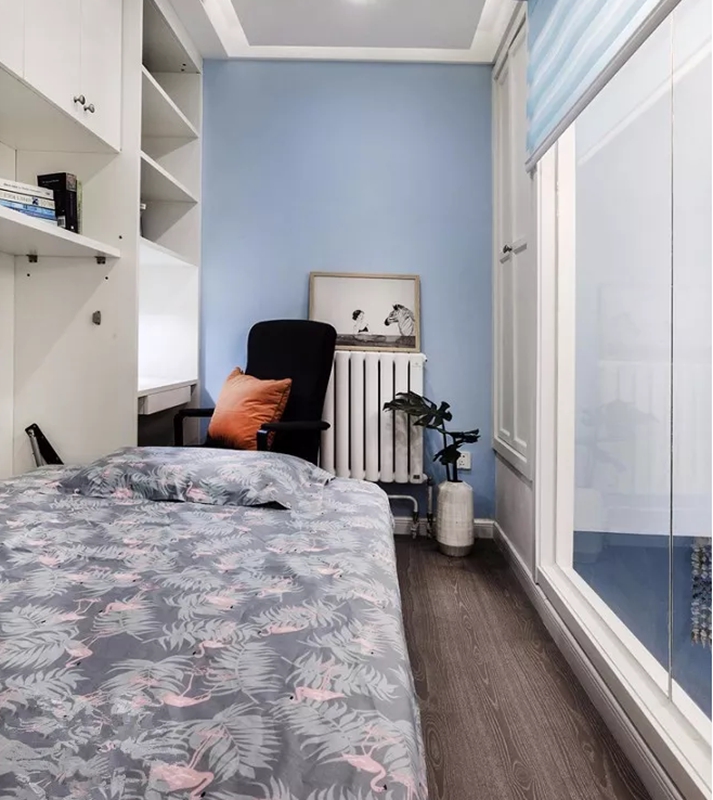 即使这间卧室的大小不到5平方米,你也可以塞一张床和一张桌子。当你把它收起来的时候,你会觉得书房特别宽敞。