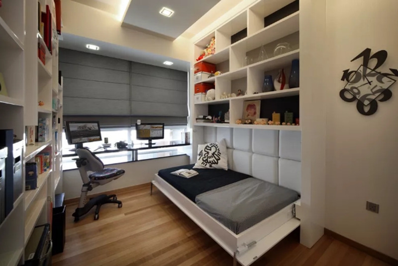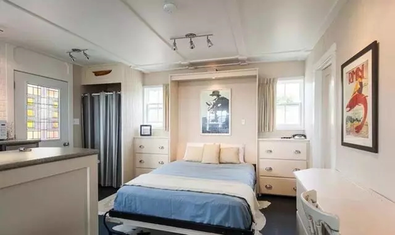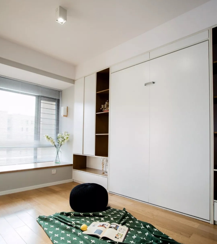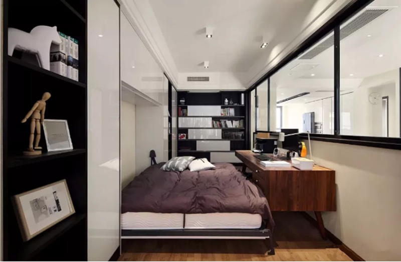 床通常藏在柜子里,空间看起来更宽敞,橱柜和桌子结合在一起,在窗户旁边做一张隔板桌子,阅读,学习更舒适。