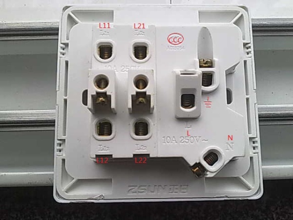 4、两位双联开关,其实这样理解是错误的。正确的理解是:两极双联一位开关,这种开关与双联开关是有区别的。它的背面有6个接线点,与两位双联开关的接线端子是一样的,而在市面上这种开关又很难买到,因为正规名牌厂家如:西门子、西蒙、TCL没有生产。只有一些杂牌很难找到,所以我在实际工作中用两个双联开关代替。
